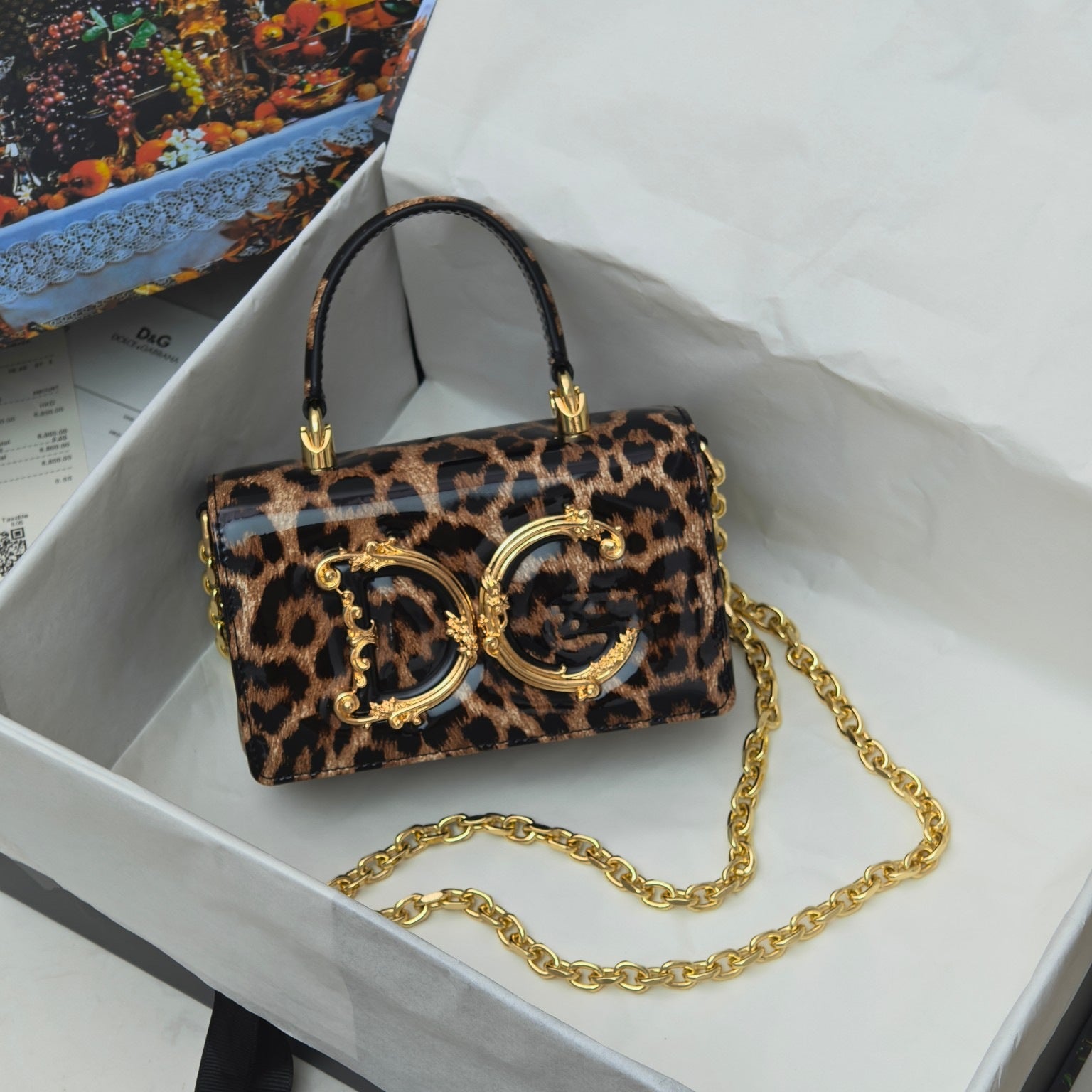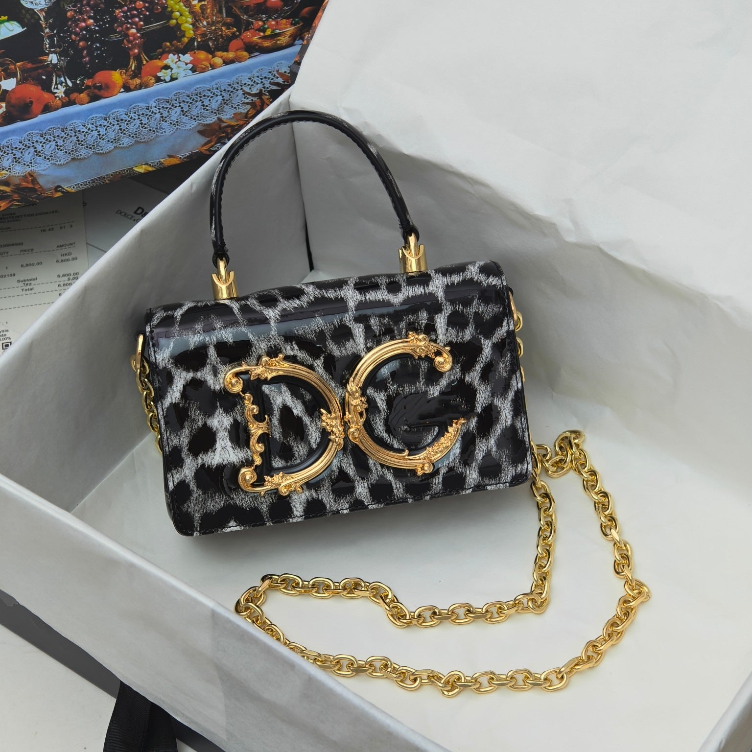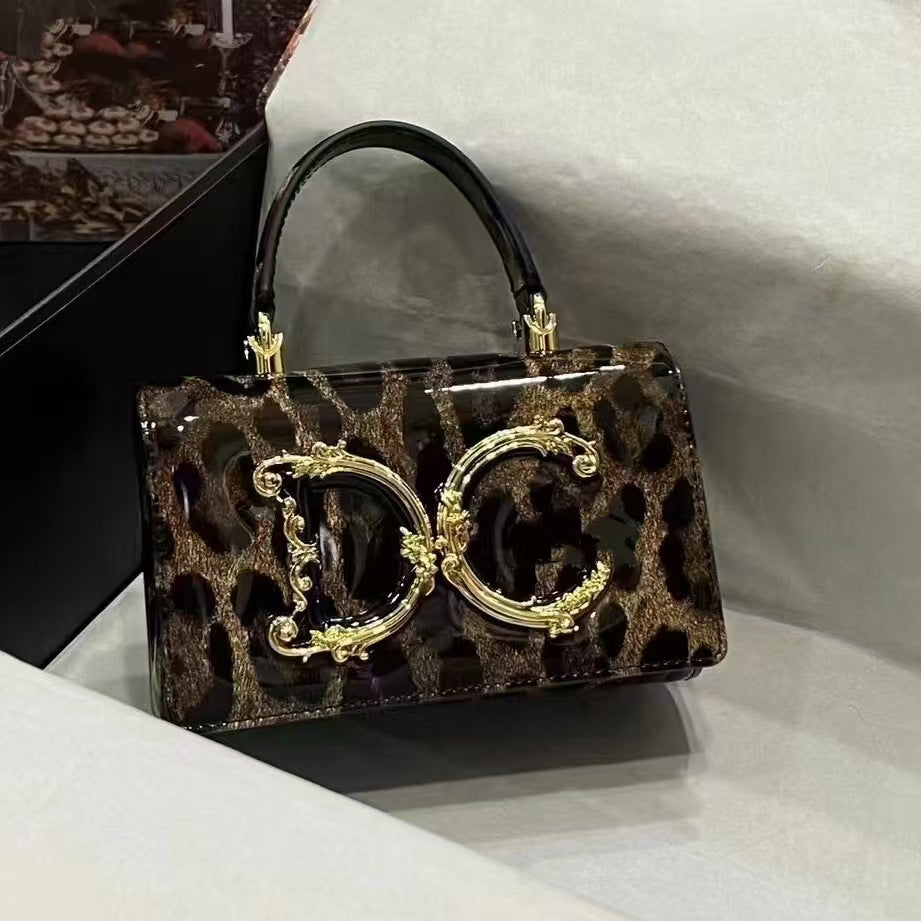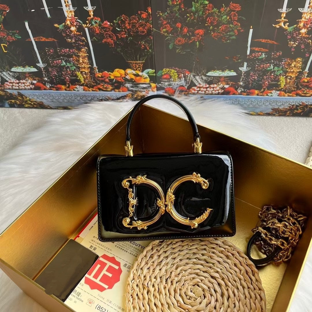 Elegant mini bag with gold DC baroque emblem, glossy leather finish, and chain strap.