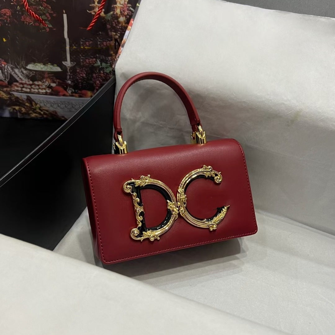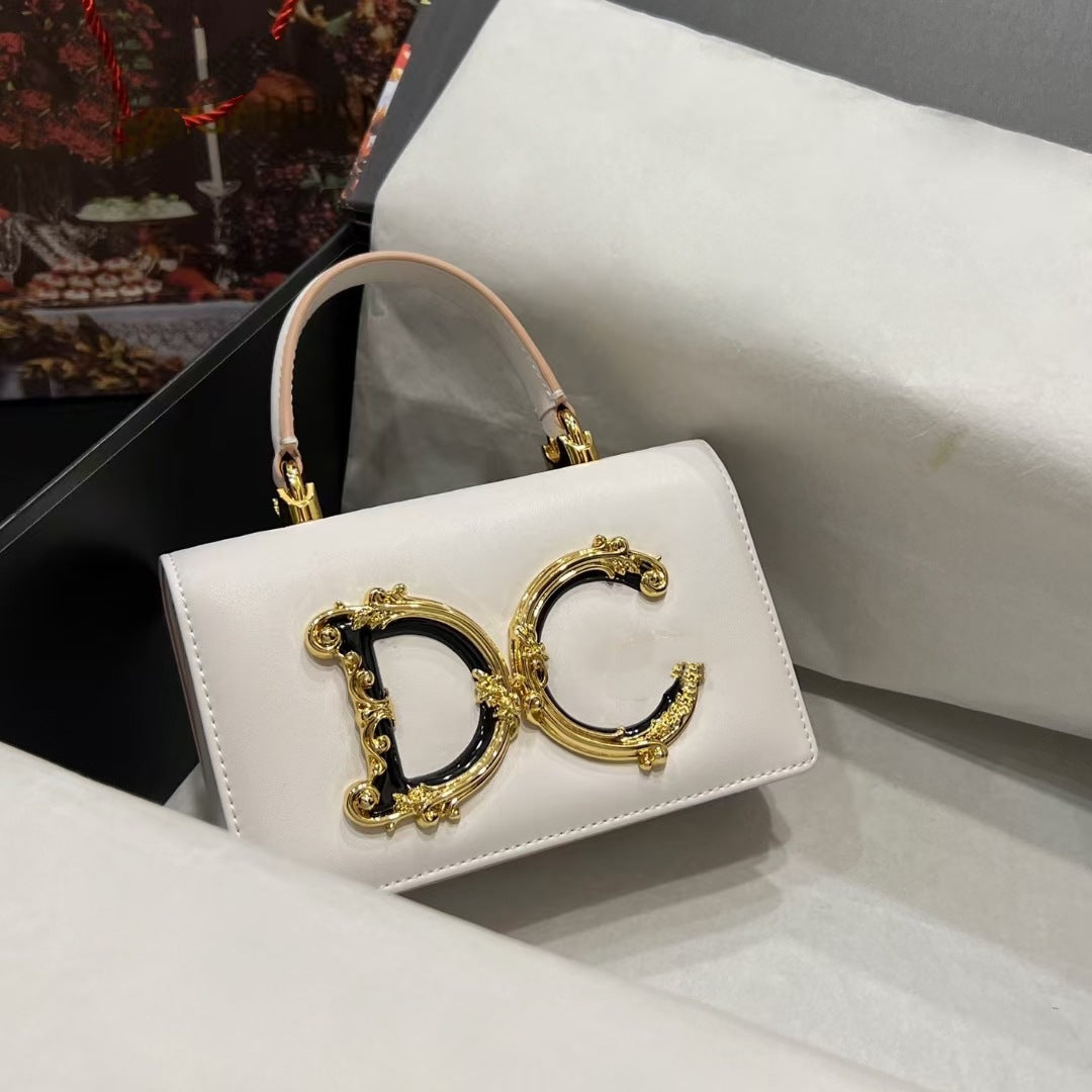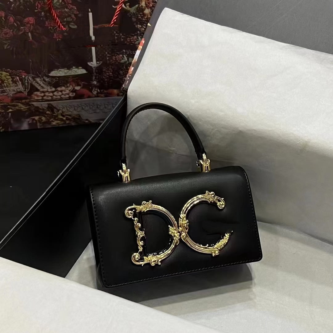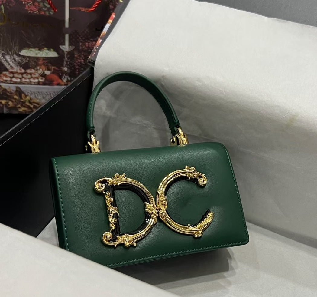 Elegant mini bag with gold DC baroque emblem, glossy leather finish, and chain strap.