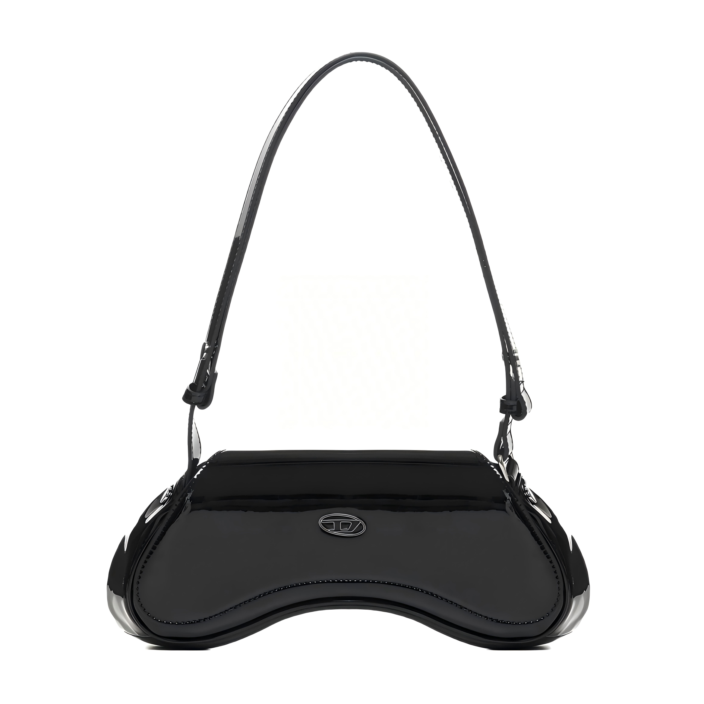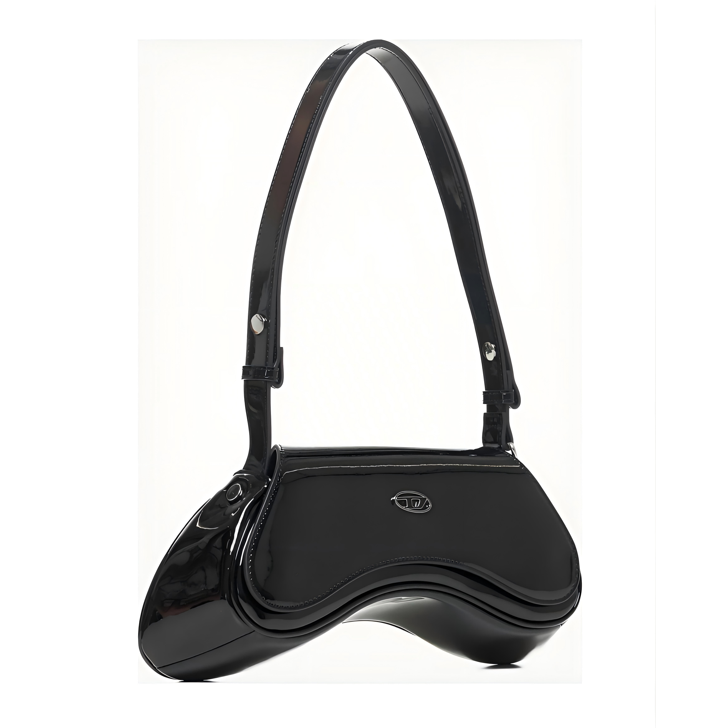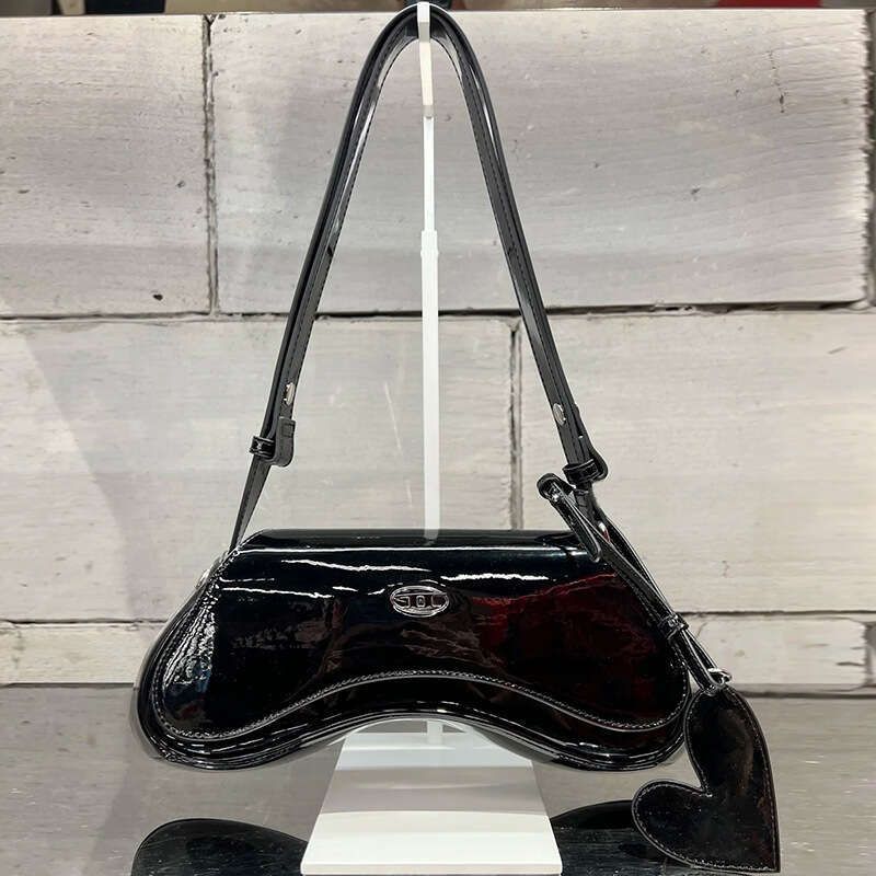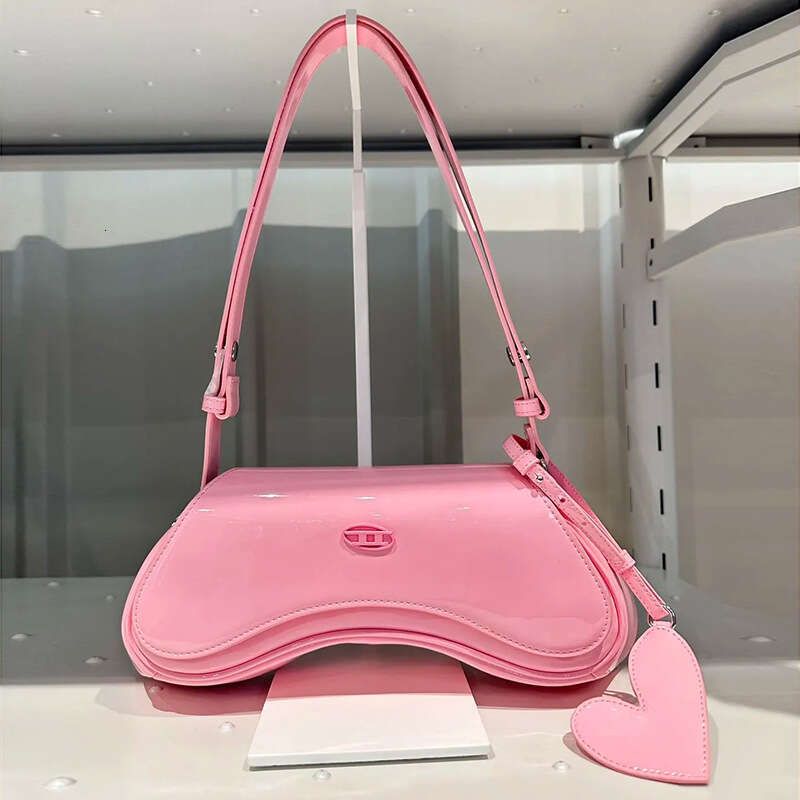27×16×7 cm glossy pink patent leather bag with heart charm, curved flap, and versatile strap.