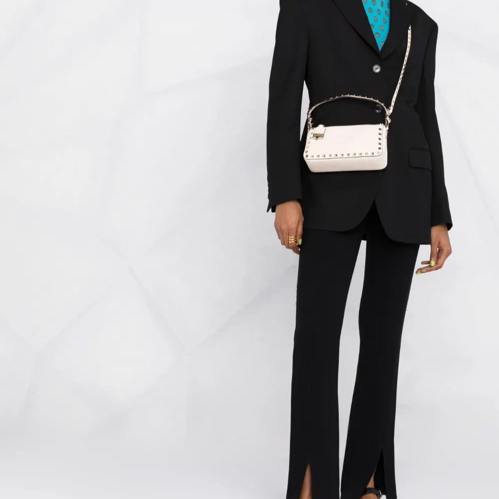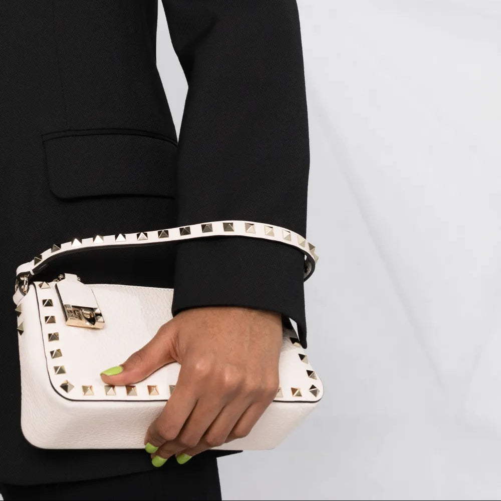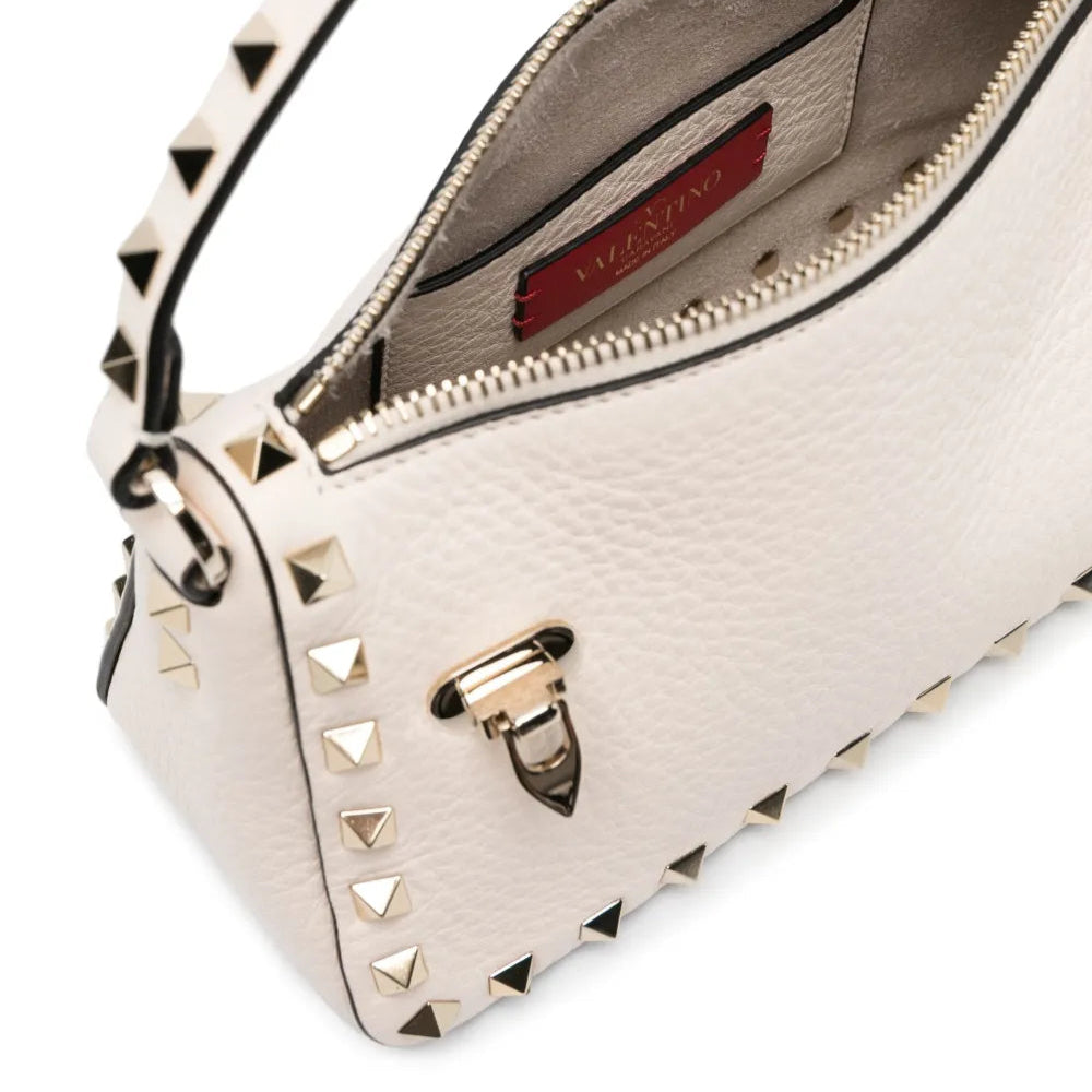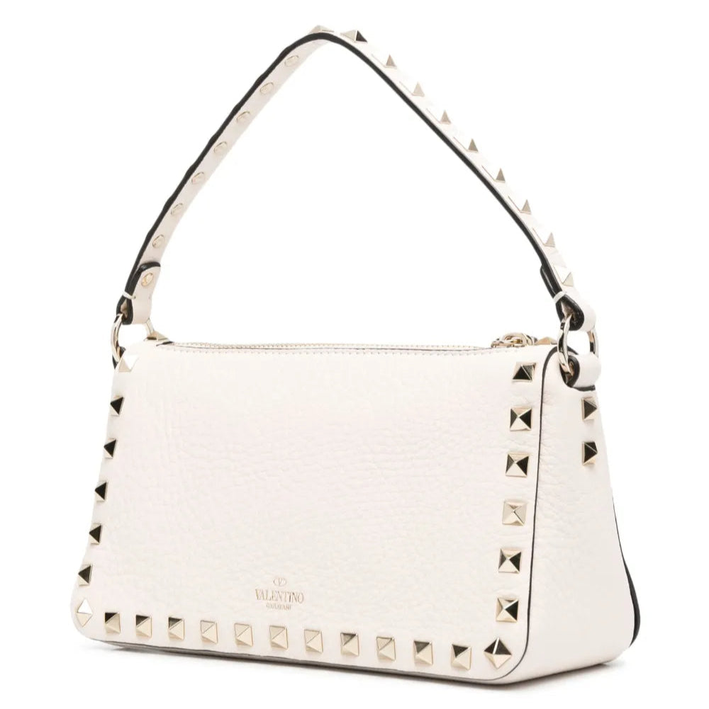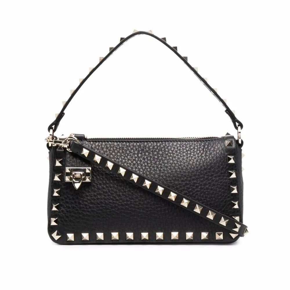 22×6×13 cm calfskin bag with gold Rockstuds, zip lock, foldable handle, detachable strap, and sleek lined interior.
